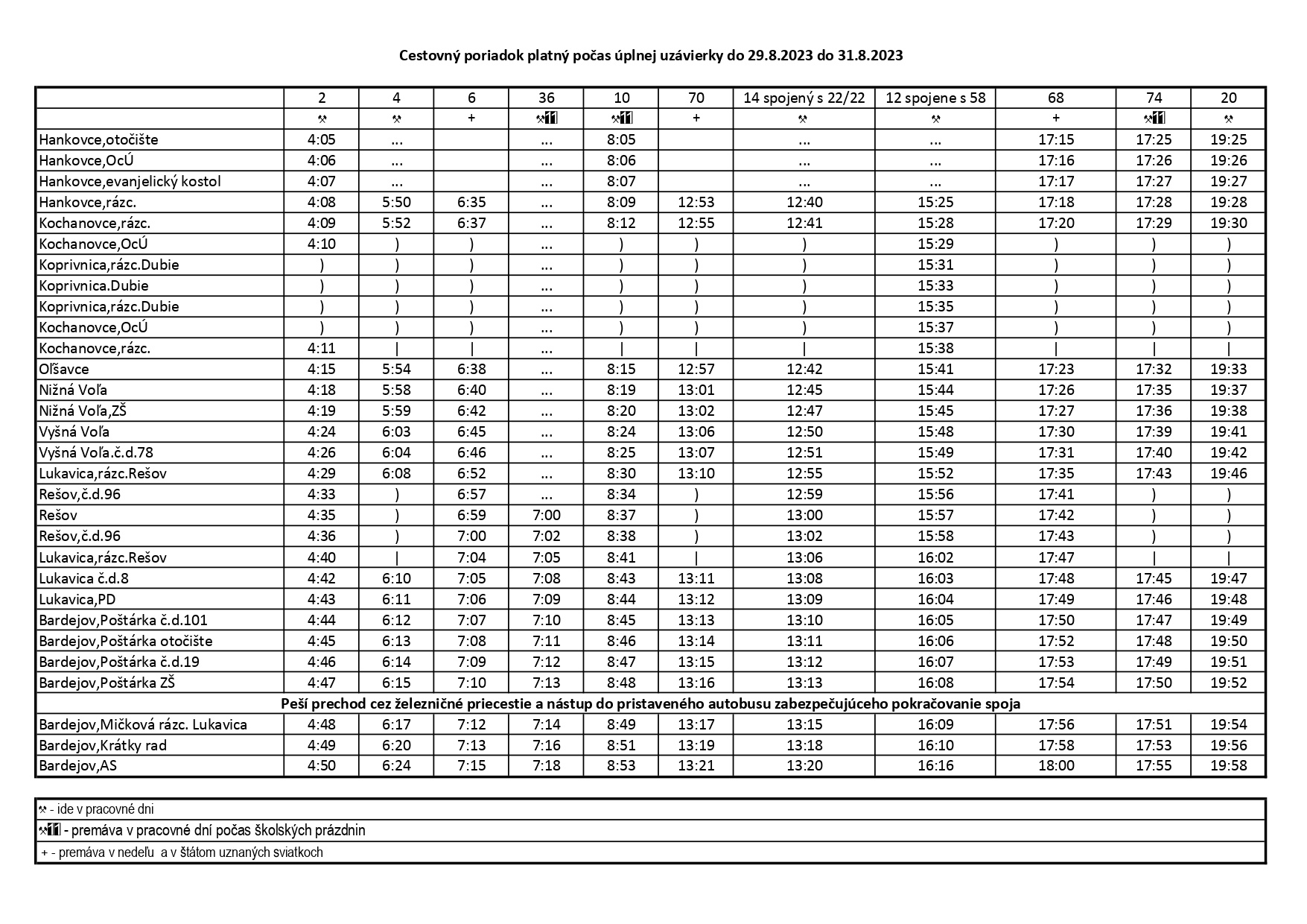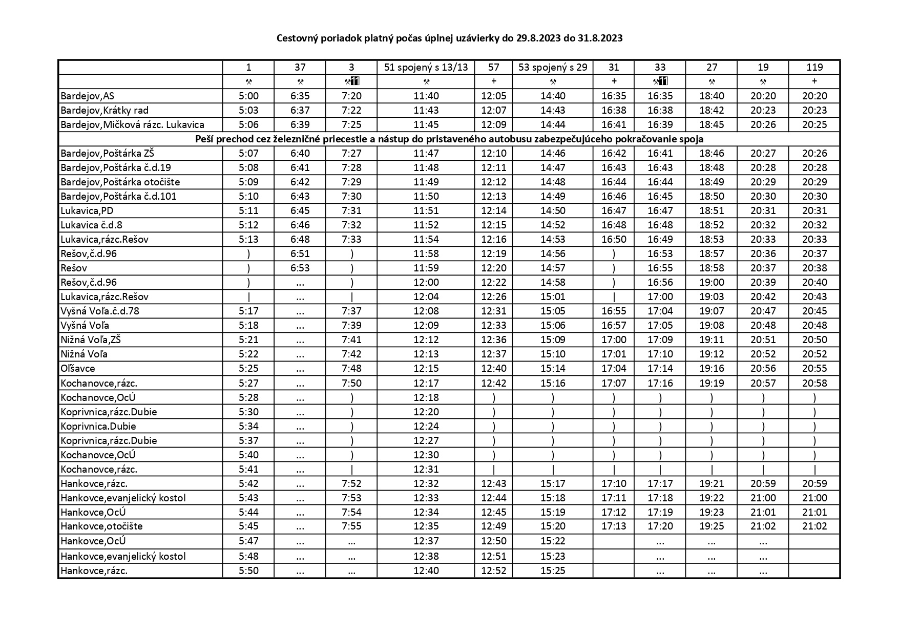 Cestovný poriadok platný počas úplnej uzávierky železničného priecestia od 29.8.2023 do 31.8.2023