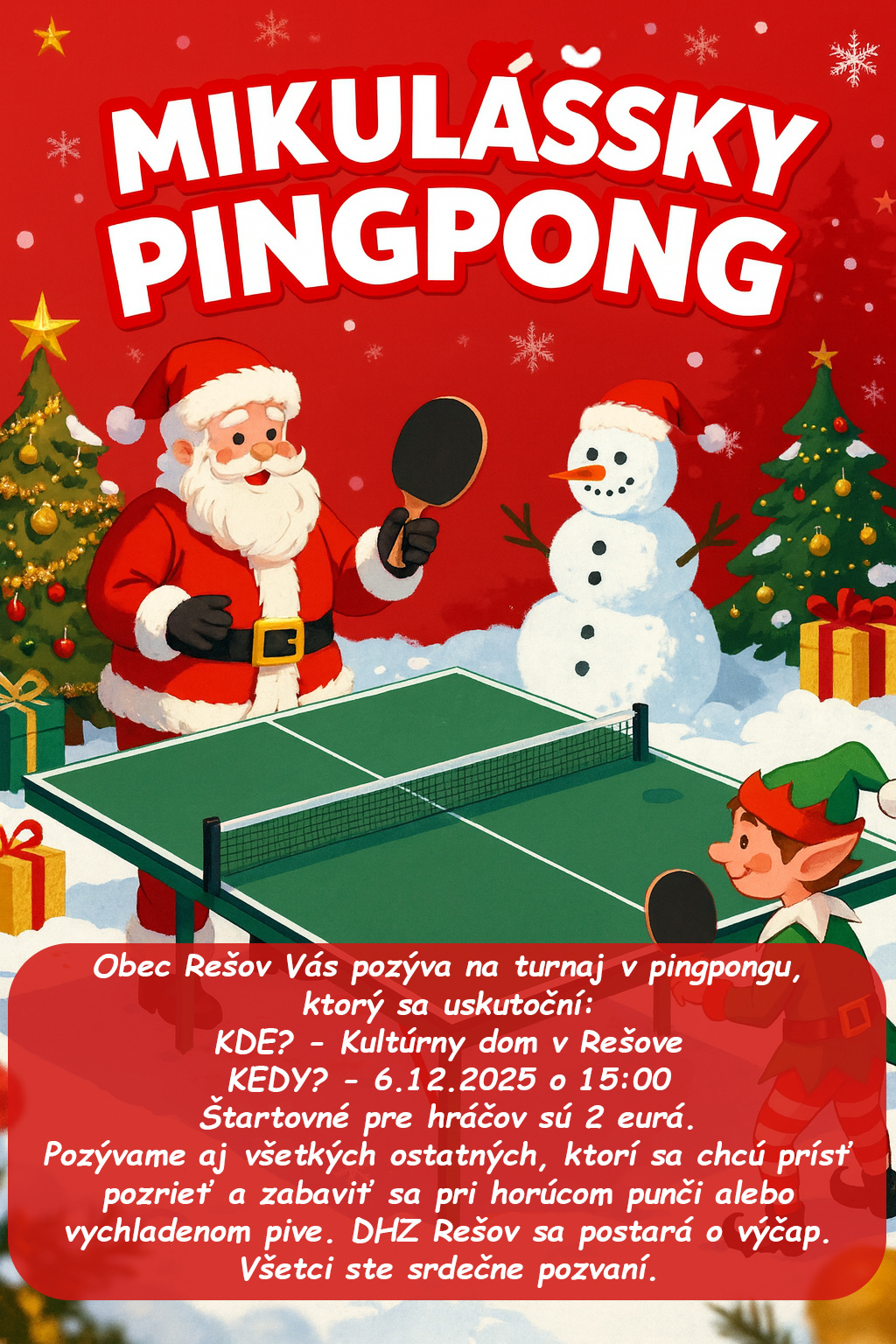 Obec Rešov Vás pozýva na turnaj v pingpongu, ktorí sa uskutoční 6.12.2025 o 15,00 hod. v Kultúrnom dome Rešove. Štartovné pre hráčov sú 2 eurá. Pozývame aj všetkých ostatných, ktorí sa chcú prísť pozrieť a zabaviť sa pri horúcom punči alebo vychladenom pive. DHZ Rešov sa postará o výčap. Všetci ste srdečne pozvaní.